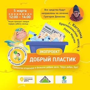 5 марта встречаемся с вами на акции «Пластик в обмен на жизнь» с 12 до 14 часов по адресу: Кострома, Красносельское шоссе, 3, Леруа Мерлен.