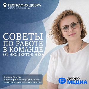 СМИ Добро.Медиа выпустили цикл материалов в рубрике «НКО-помощь», где директор Фонда «География Добра» Оксана Одегова делится своим управленческим опытом. Это честный разговор о команде, напряжении и том, как сохранить атмосферу, в которой хочется работать и помогать.