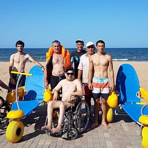 Это первый в России бесплатный общественный пляж на берегу Каспийского моря, оборудованный для людей на инвалидных колясках.